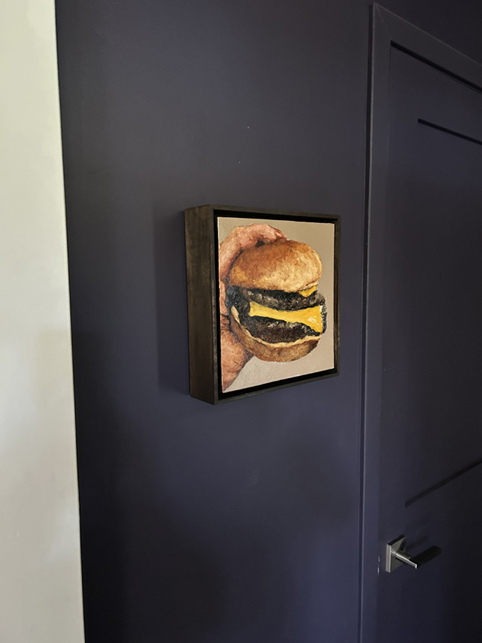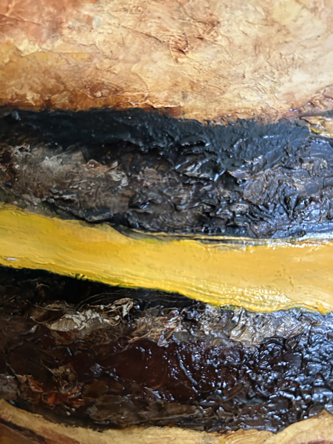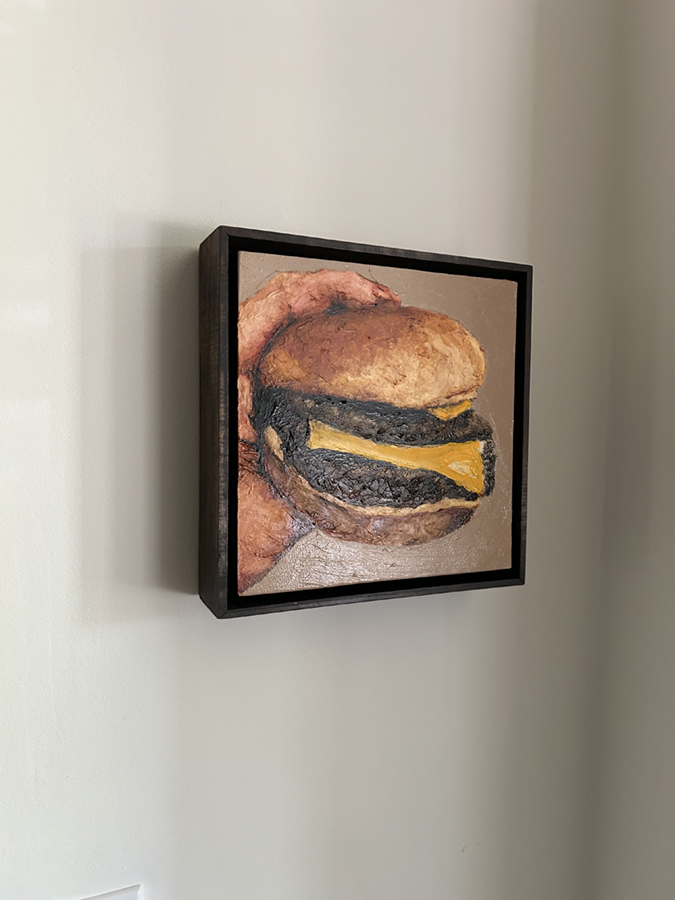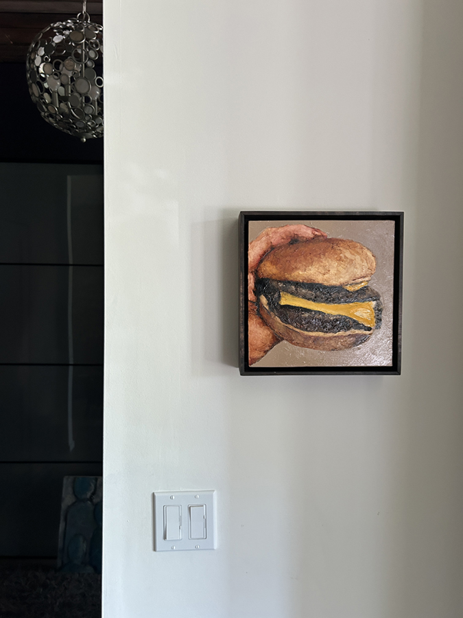 This image is from photos of a still life I took.  As part of the food series, I ingested the food, so the subject of the art powered it’s creation.  I panted with a pallet knife and thin layers of oil paint. Painted in 2025.